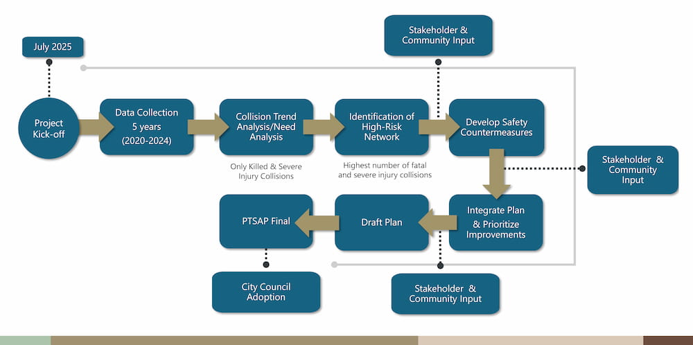 Developing the Pleasanton Transportation Safety Action Plan is a multi-step process that benefits from community collaboration at key moments, below is a flow chart of this process.